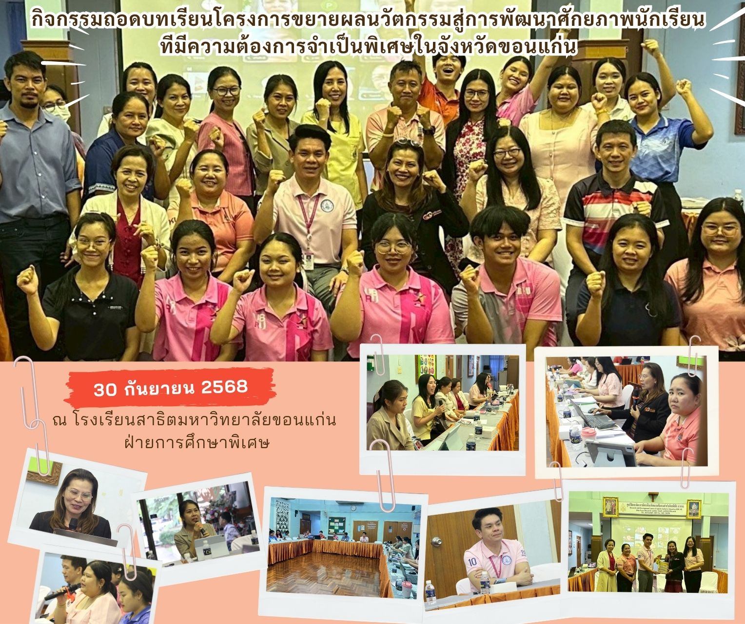 โรงเรียนสาธิตมหาวิทยาลัยขอนแก่น ฝ่ายการศึกษา จัดกิจกรรมถอดบทเรียนโครงการขยายผลนวัตกรรมสู่การพัฒนาศักยภาพนักเรียน ทีมีความต้องการจำเป็นพิเศษในพื้นที่จังหวัดขอนแก่น พร้อมรายงานผลต่างๆ ณ ลานกิจกรรม โรงเรียนสาธิตมหาวิทยาลัยขอนแก่น ฝ่ายการศึกษาพิเศษ ภายใต้งบประมาณแผ่นดิน ของ สํานักงานพัฒนาสังคมและความมั่นคงมนุษย์จังหวัดขอนแก่น