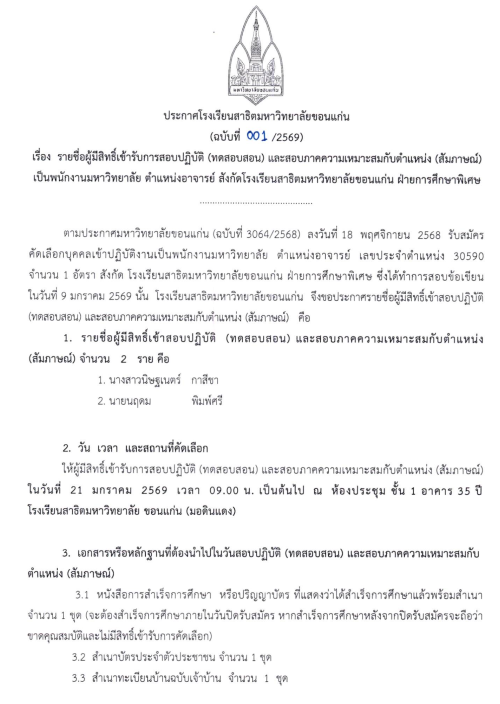 รายชื่อผู้มีสิทธิ์เข้ารับการสอบปฏิบัติ (ทดสอบสอน) และสอบภาคความเหมาะสมกับตำแหน่ง (สัมภาษณ์) เป็นพนักงานมหาวิทยาลัย ตำแหน่งอาจารย์ สังกัดโรงเรียนสาธิตมหาวิทยาลัยขอนแก่น ฝ่ายการศึกษาพิเศษ